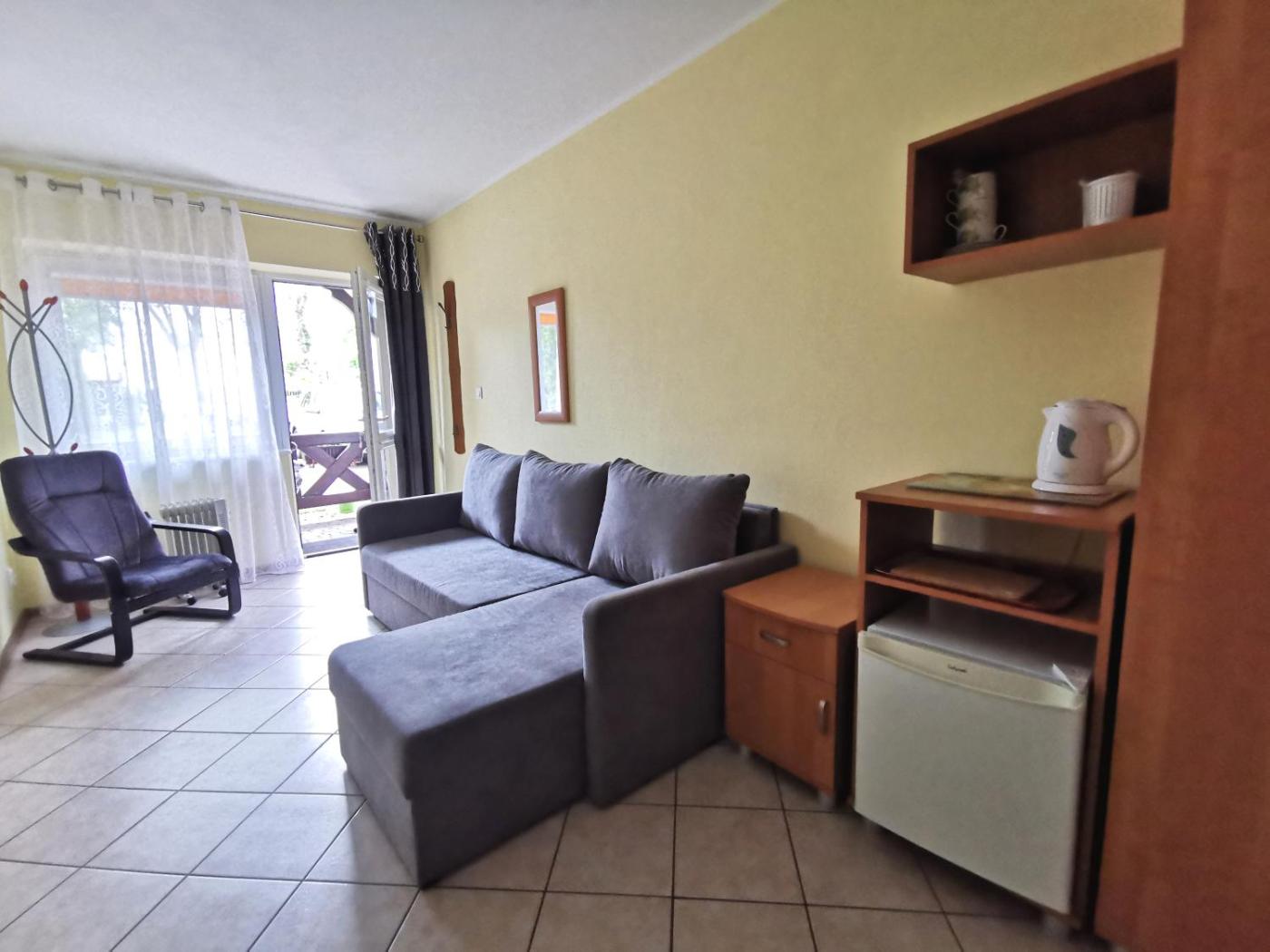 Studio z rozkładaną sofą. Guests will find a stovetop, a refrigerator, kitchenware and a microwave in the kitchenette. The studio also features a barbecue. This studio has a private bathroom, a private entrance, a dining area as well as an outdoor dining area. The unit has 1 bed. Studio - 2 osobowy. Powierzchnia pokoju ok.: 13 mkw. ;